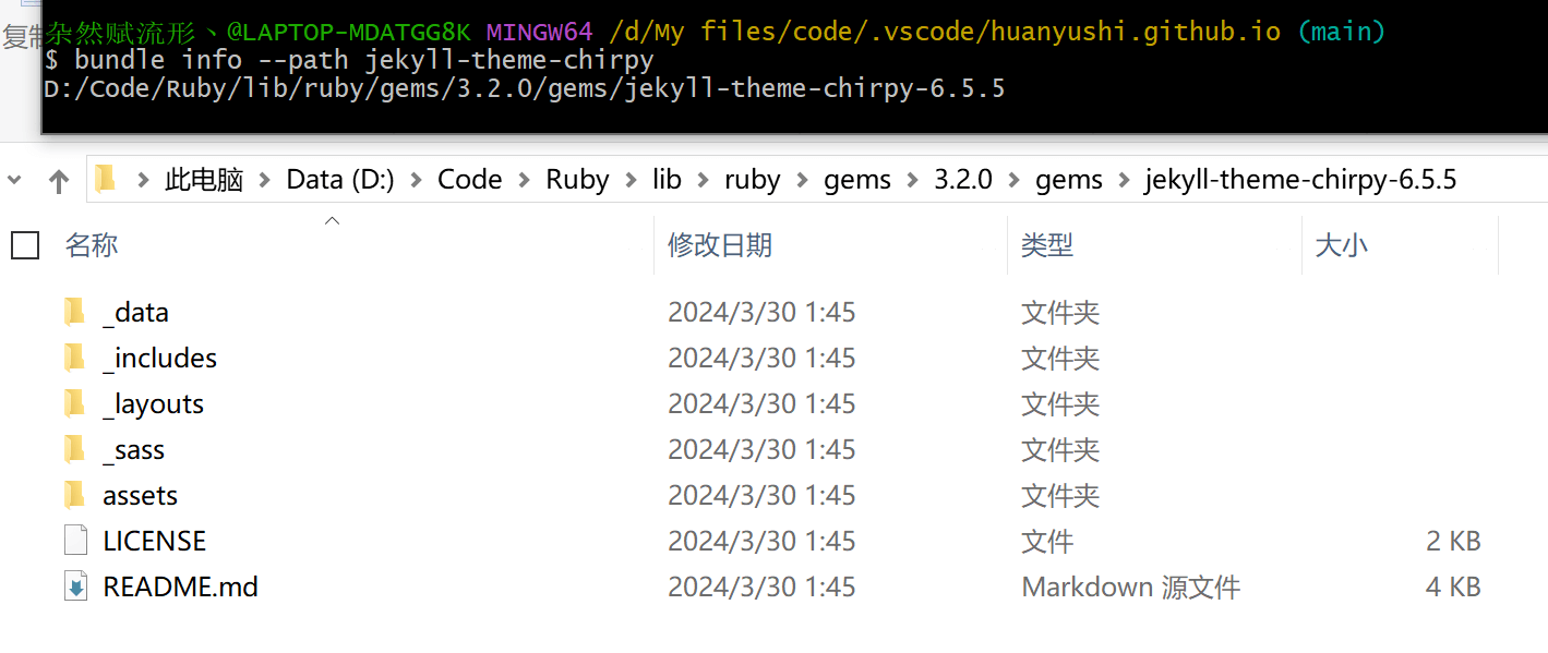 但原先我使用的模板是 Huxpro,最近花了一点时间把模板改成了 Chirpy。以前 Jekyll 把主题样式和博客内容混杂在一起,不利于编辑,但在 3.2.0 版本后,Jekyll 引入了 gem-based theme,把网站的样式封装成了一个 gem 包,实现了主题样式和博客内容的分离(这有点类似于 HTML 和 CSS)。Chirpy 模板正是一个 gem-based theme,所以利用 Chirpy Starter 生成的 blog,它只包含了内容文件,要想实现对 Chirpy 模板的个性化处理,就必须找到它的样式文件。