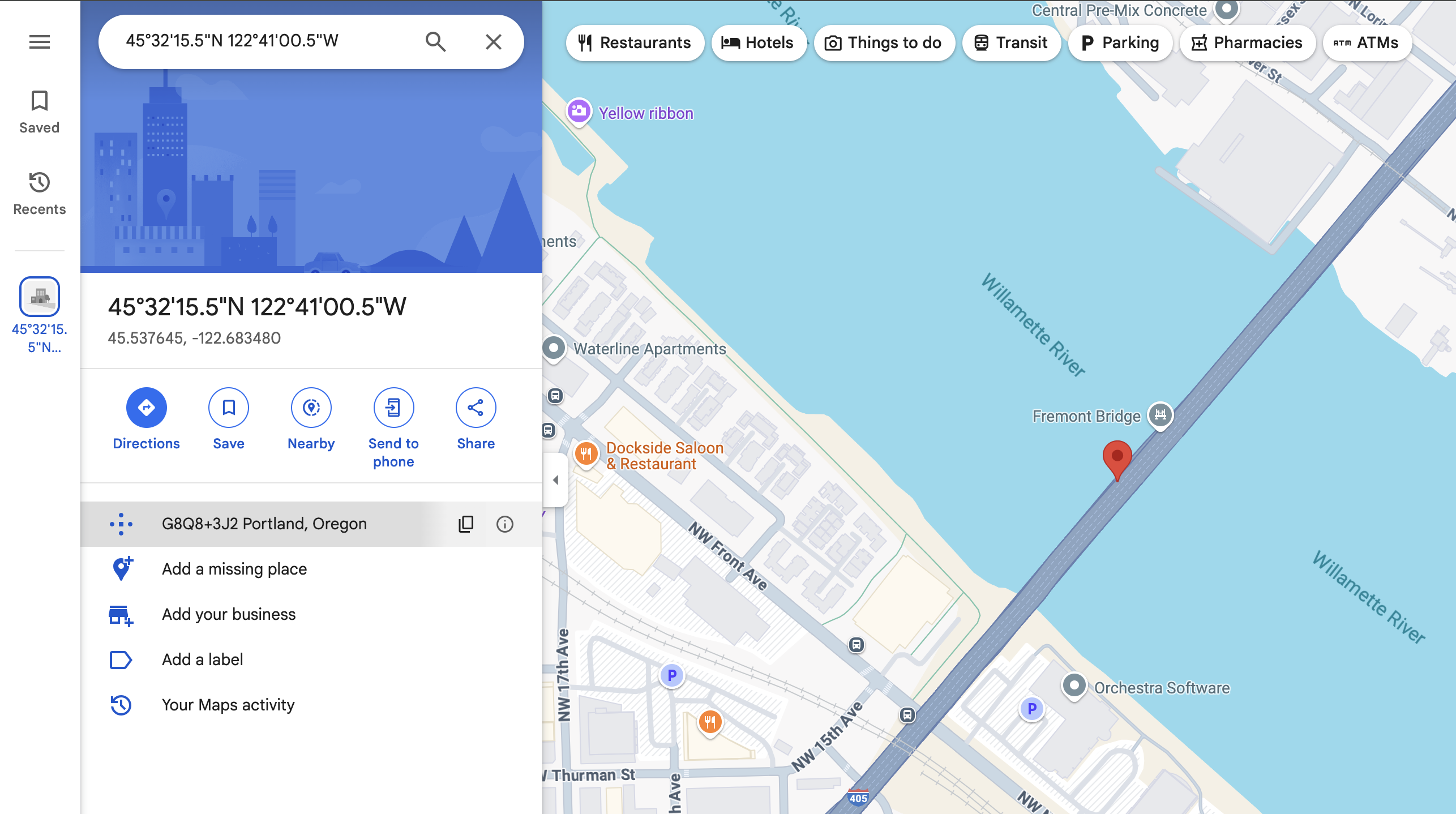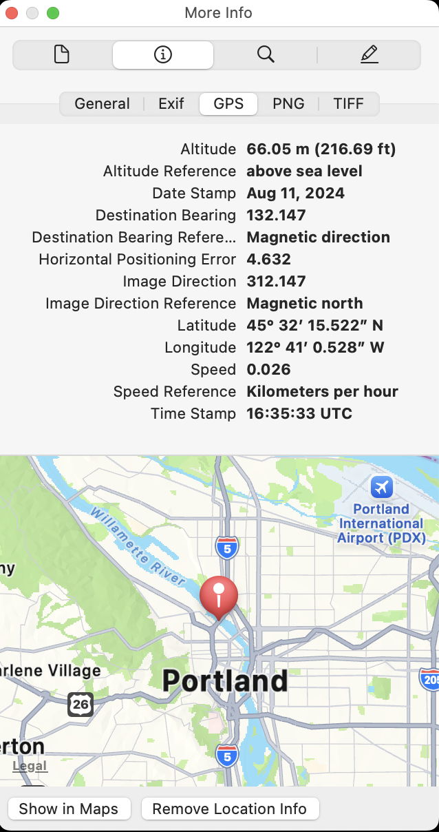 You can copy the coordinates, Latitude: 45° 32’ 15.522” N, Longitude: 122° 41’ 0.528” W, reformat them to standardize them as (45° 32' 15.522", -122° 41' 0.528"), and paste them into the Apple Maps application on a macOS computer to view the location on a map.